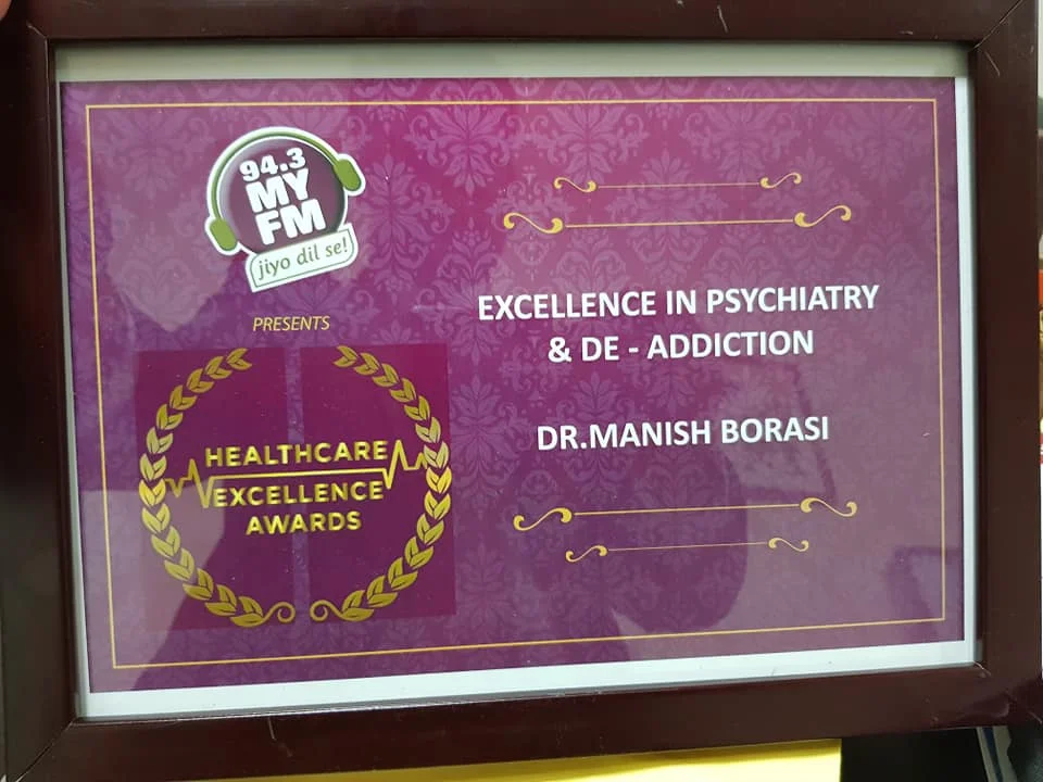 Dr. Manish Borasi Best Psychiatrist in Bhopal receiving healthcare excellence award MY FM event